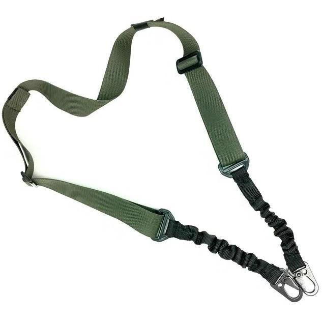 Тактичний двоточковий ремінь виготовлений з ремінної стрічки 4 см для більшого комфорту при перенесенні зброї та безпеки при використанні. Має дві точки фіксації та підходить під різноманітні види зброї. Довжина регулюється двома пряжками. До зброї кріпиться двома металевими карабінами. Еластичні вставки перед карабінами зменшують навантаження на плече й знижують трясіння при ходьбі та швидкому переміщені. • Вага – 135 г. • Колір – олива
