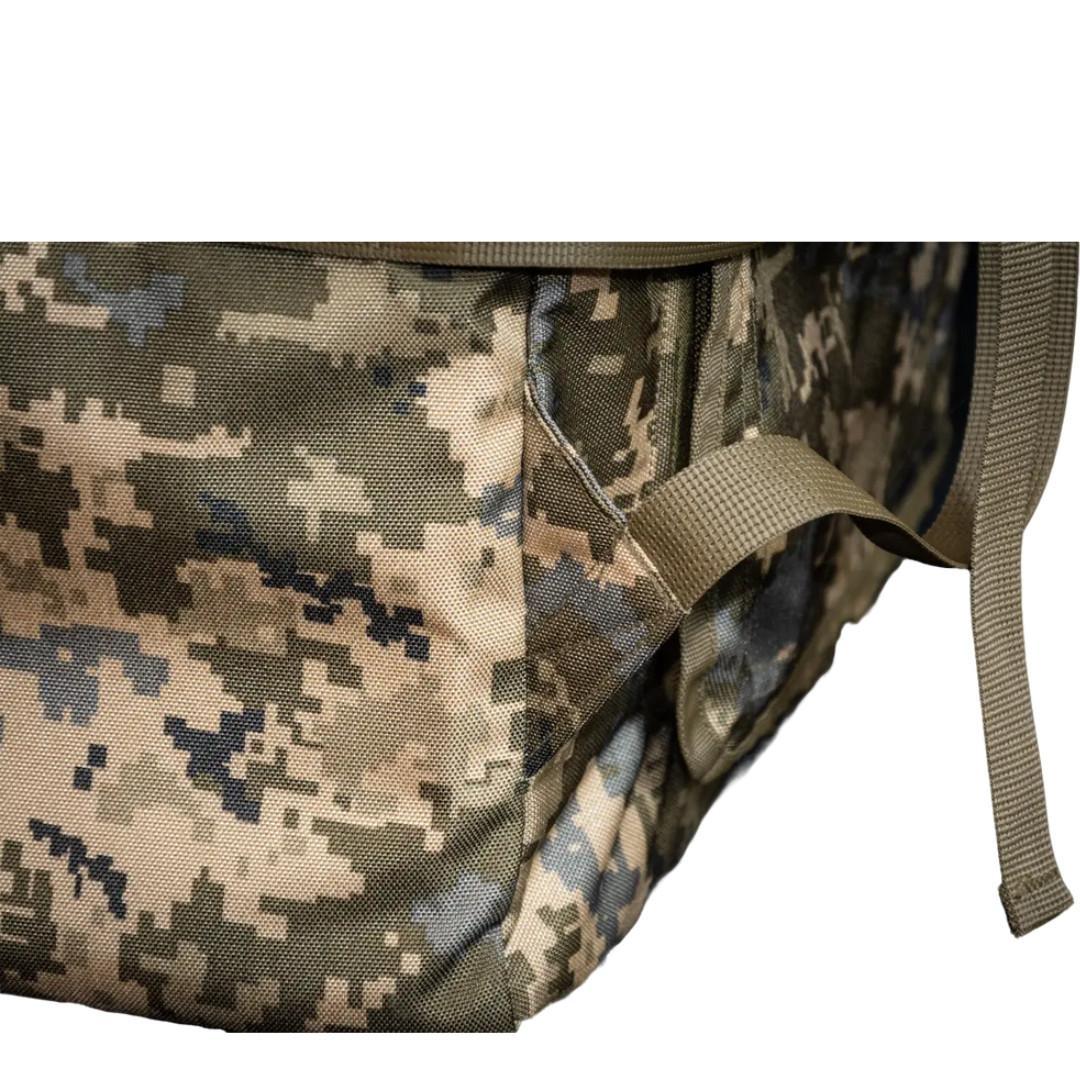 Військовий рюкзак призначений для зберігання та перенесення екіпіровки, особистих речей, виконання військових завдань, риболовлі, туризму, полювання, спорту тощо. Данна модель розрахована на кількість провізії та речей на період до 30 днів на одну особу. У цій моделі окрім головного відділеня є два внутрішніх відділення на блискавках, для комфортного розміщення необхідних речей. Дуже зручний тактичний рюкзак об'ємом 130 літрів, який стане в нагоді як в армійських цілях, так і для міських умов. Також їх часто використовують у походах та для риболовлі. Широкі лямки рівномірно розпреділяють навнатаження на плечі та спину. Нагрудний ремінь, що з'єднує дві лямки і проходить упоперек грудей, суттєво знижує навантаження на спину та плечі. Також він допомагає зафіксувати рюкзак і запобігає його зісковзування з плеч під час руху. Ручки для носіння розташовані горизонтально та вертикально. Габаритні розміри: ширина 80 см, глибина 41 см, висота 95 см. Характеристики:Тканина: Кордура 1000D; Розмір: 80х41х95 см (ШхДхВ); Об'єм: 130 літрів; Колір: піксель.