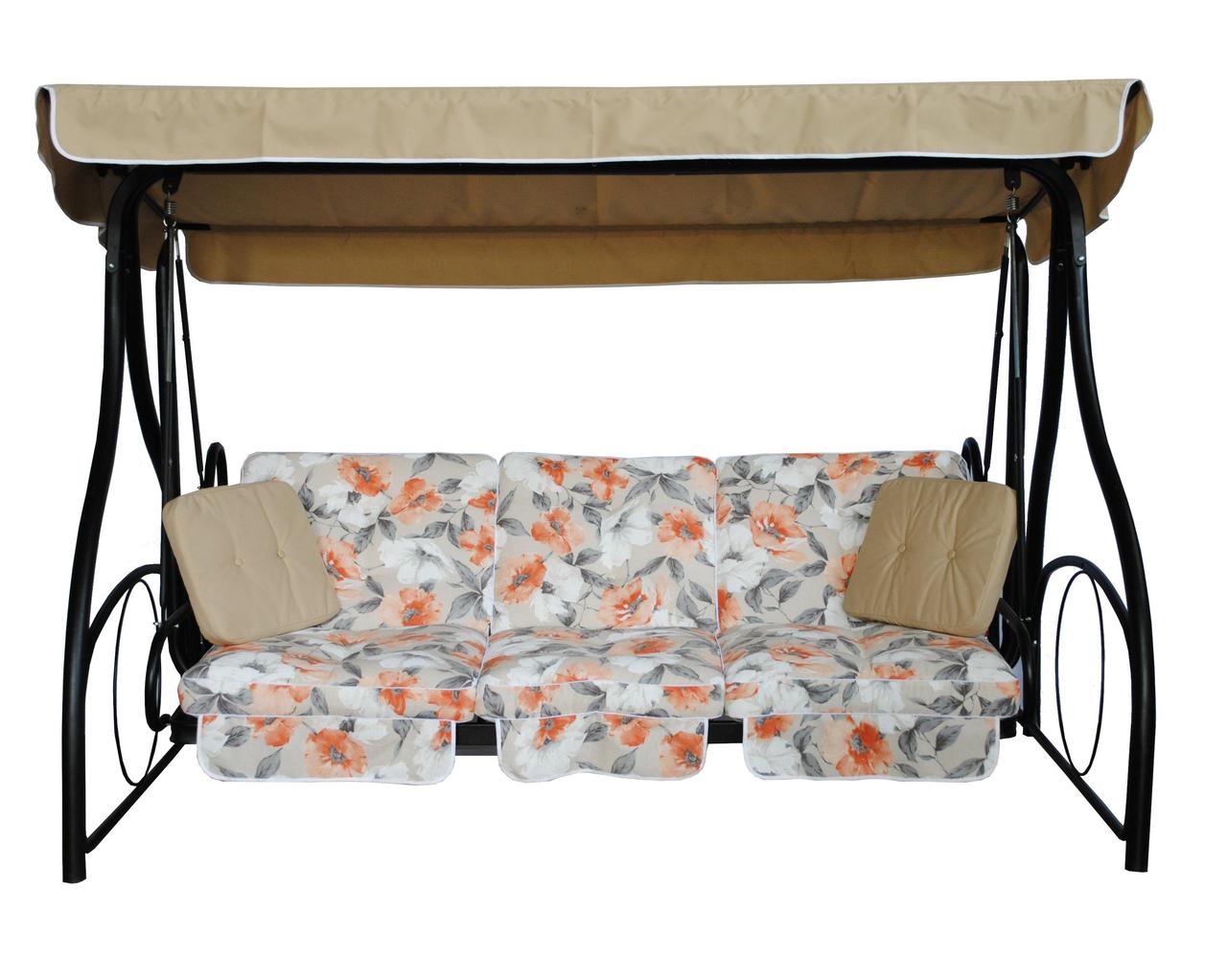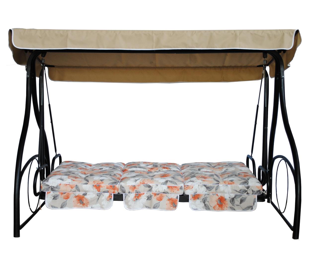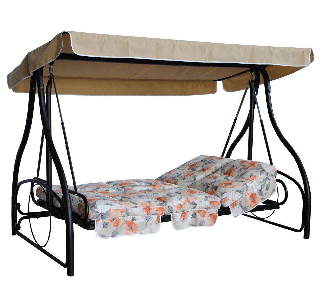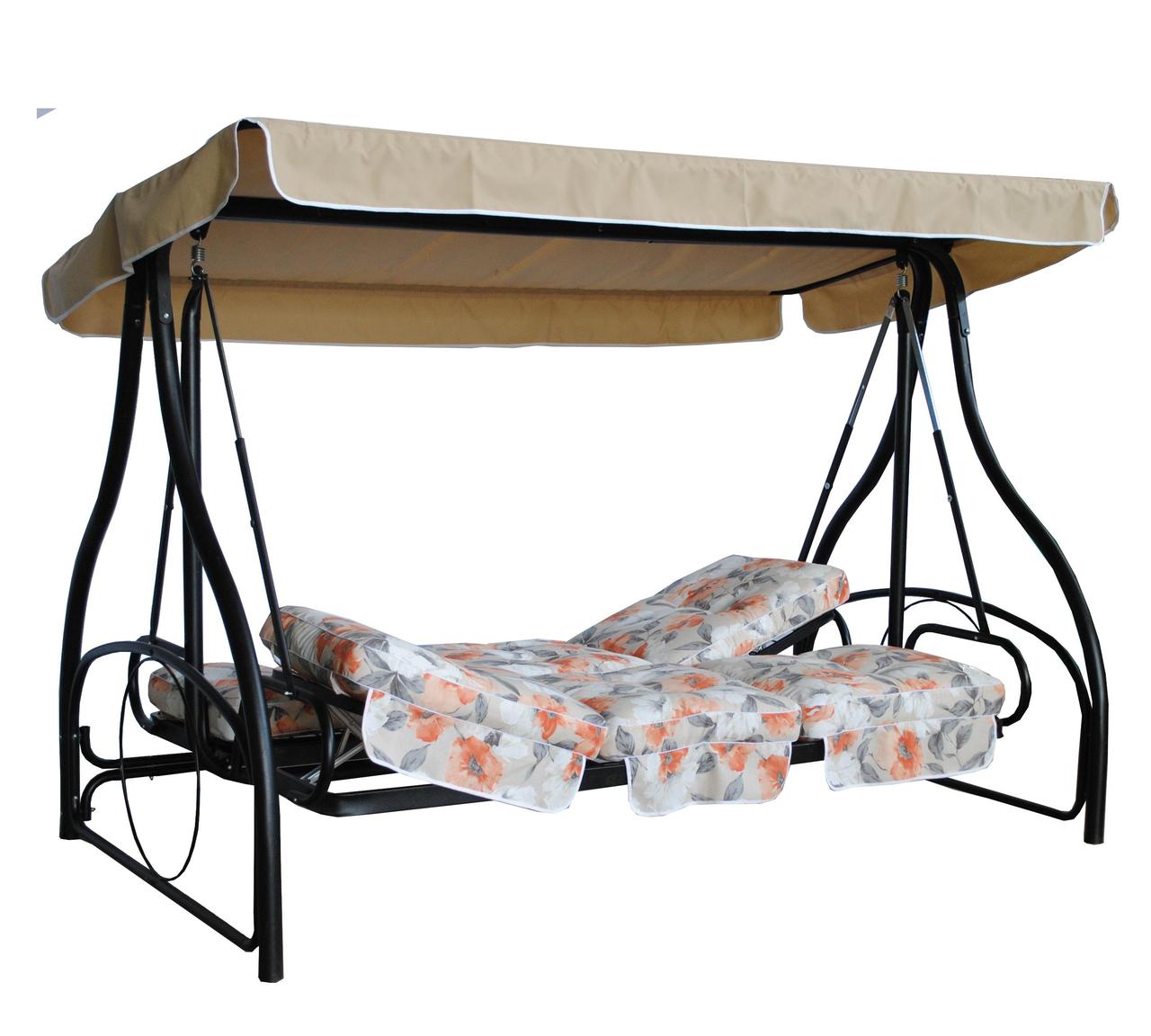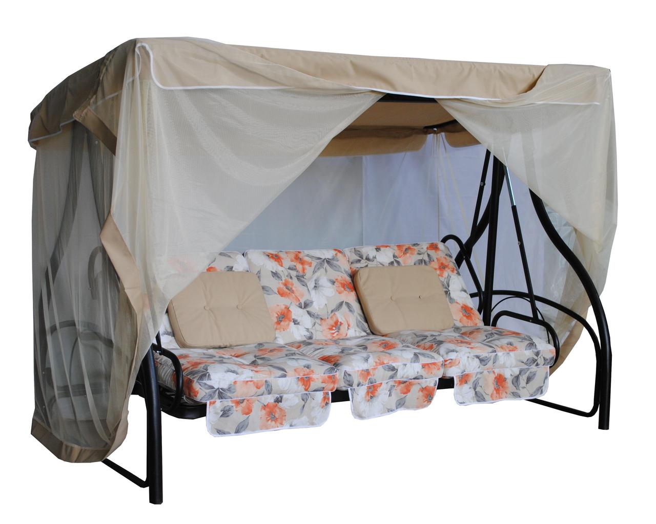 Садова диван-гойдалка з прямокутним дахом і з довжиною сидіння 200 см. Призначена для відпочинку 4-5-ти дорослих осіб. Каркас садової гойдалки виготовлений із сталевої труби діаметром 60 мм і покритий полімерною фарбою, яка сприяє підвищенню зносостійкості гойдалки, а саме, не розтріскується і захищає метал від іржі. Сидіння і спинка гойдалки - пружна металева сітка на пружинах. Вона не провисає і в той же час є досить комфортною для відпочиваючого. Сидіння можна зафіксувати від розгойдування за допомогою гачків розташованих на ніжках гойдалки. Дана модель легко трансформується з дивана в ліжко. Для цього досить підняти ручку з будь-якого боку вгору і відкинути спинку. Кут нахилу тенту (нахил вгору-вниз) регулюється бічними фіксаторами на даху. Гойдалка комплектується: матрацом, тканинним тентом, подушками - 2 шт., москiтною сiткою. Оббивка матраца виготовлена з тканини лонета (70% бавовна, 30% поліестер): Тент і подушки виготовлені з тканини тексілк. Ця тканина спеціально розроблена для вуличних меблів і має такі переваги: брудо- і вологовідштовхуюча, має високу міцність на розрив, стійка до хлору та інших дезінфектантів гіпоалергенна, захищає від сонячного УФ-випромінювання не схильна до вигоряння 100% зроблена в Європі 100% переробляється. Матрац прикріплюється до сидіння за допомогою липучок. Наповнювач матраца - поролон+сінтепон, наповнювач подушок - холлофайбер. Товщина матраца - 10 см. Тент кріпиться до каркаса за допомогою пришитих тканинних направляючих куди втягуються труби даху. Догляд: чохол можна прати при температурі до 40 градусів С, прасувати при низьких температурах. Хімічна чистка заборонена. Виробництво каркаса - Італія. Виробництво м'яких елементів - Україна.