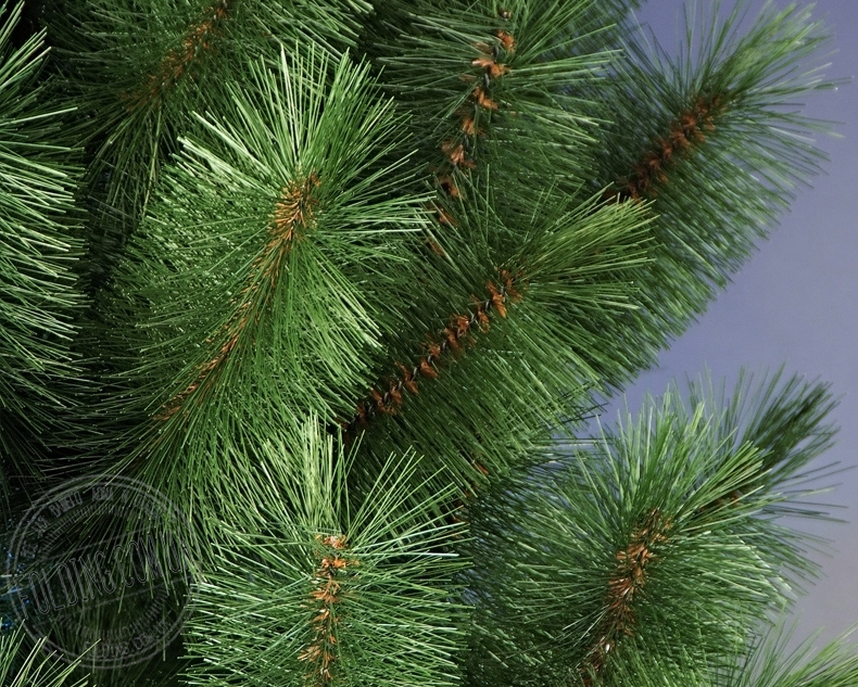 Материал, из которого производится хвоя сосны искусственной с цельной иголкой 2,6 м. это пожаробезопасная леска. Ствол, стальная труба, состоит из двух частей, а ветки изготовлены из прочной гибкой проволоки.
