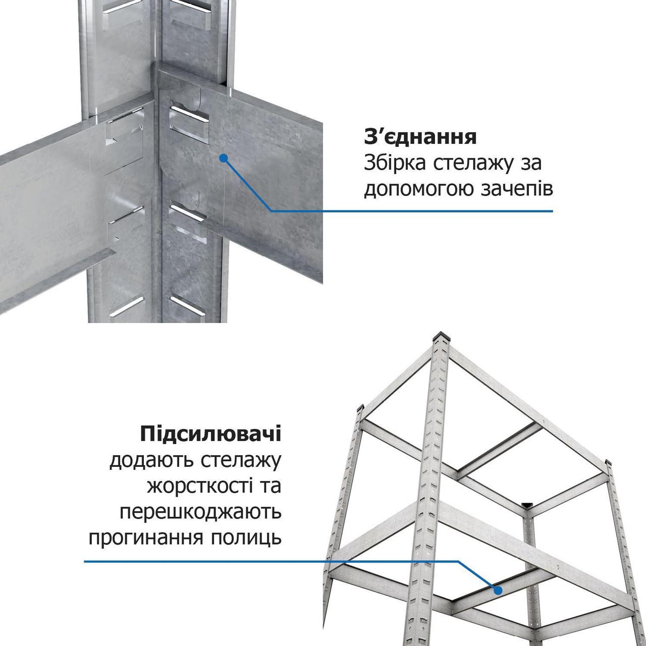 • Полиці стелажу кріпляться на зачіпках, що полегшує та прискорює процес складання (15-30 хв).