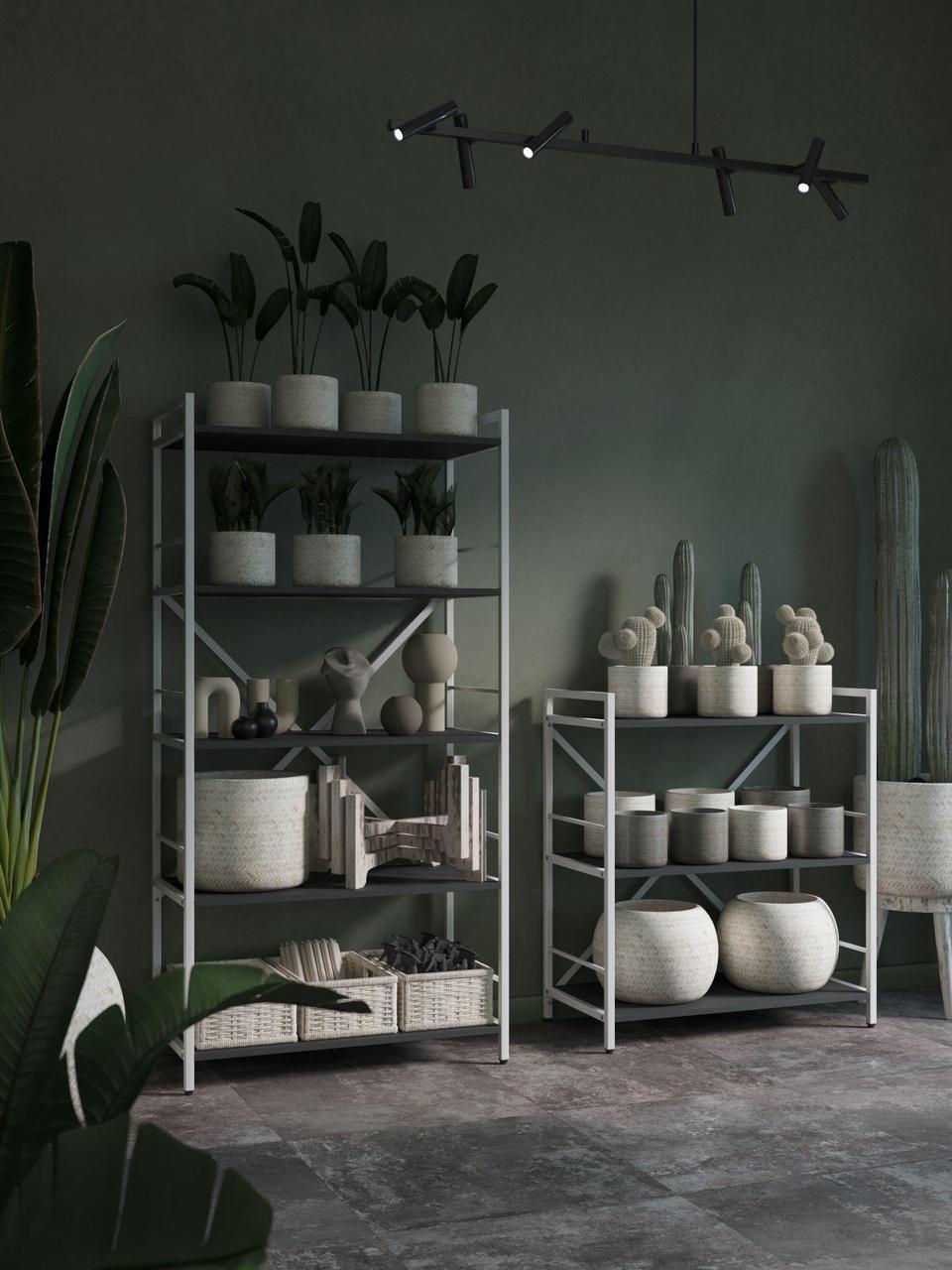 Модель доступна у двох варіантах каркаса: Білий або Антрацит. Полиці можна вибрати у відтінках, які часто застосовуються як базові в лофт-дизайні.
