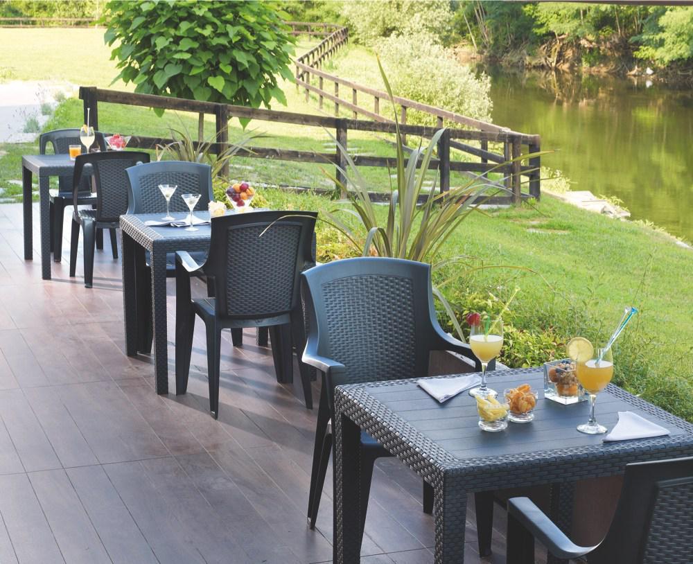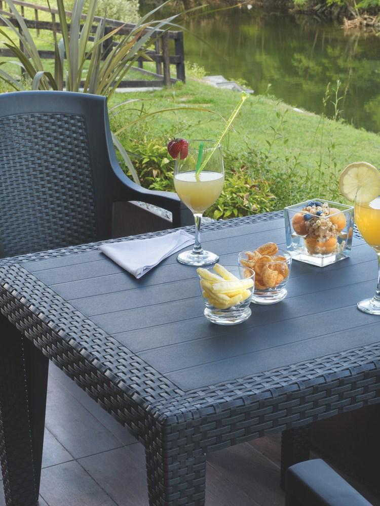Цей матеріал має високу стійкість до різноманітних природних факторів, таких як висока вологість, перепади температур, УФ-випромінювання сонячного світла, тому стіл можна зберігати на відкритих майданчиках.