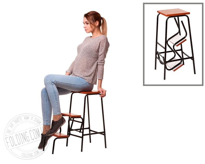 В сложенном состоянии – это полноценный, добротный стул, который одним легким движением можно трансформировать в небольшую лестницу-стремянку на три ступени.