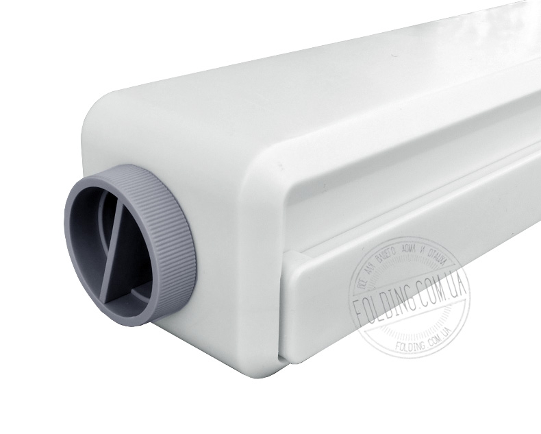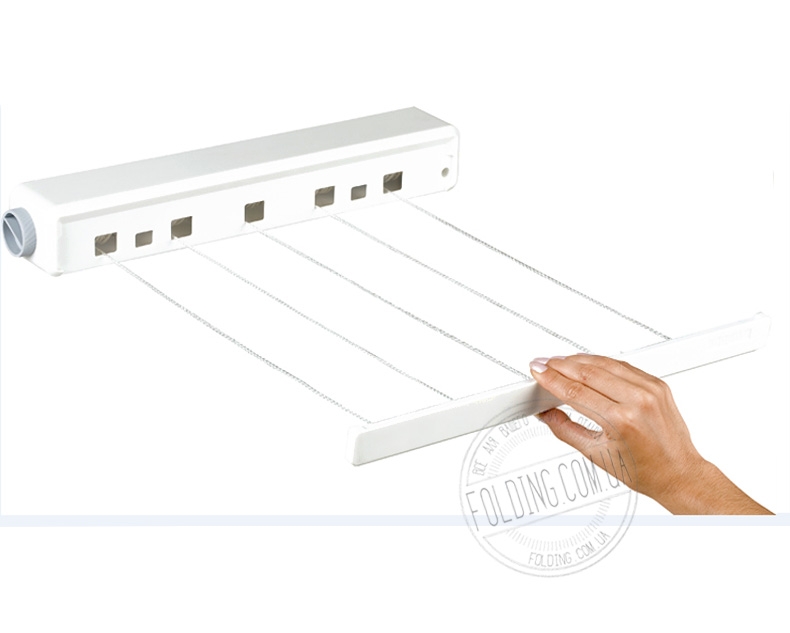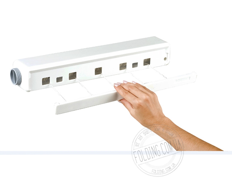 После эксплуатации рейка с веревками снимается с крючков и возвращается в исходное положение (в короб сушилки) при помощи инерционного механизма.
