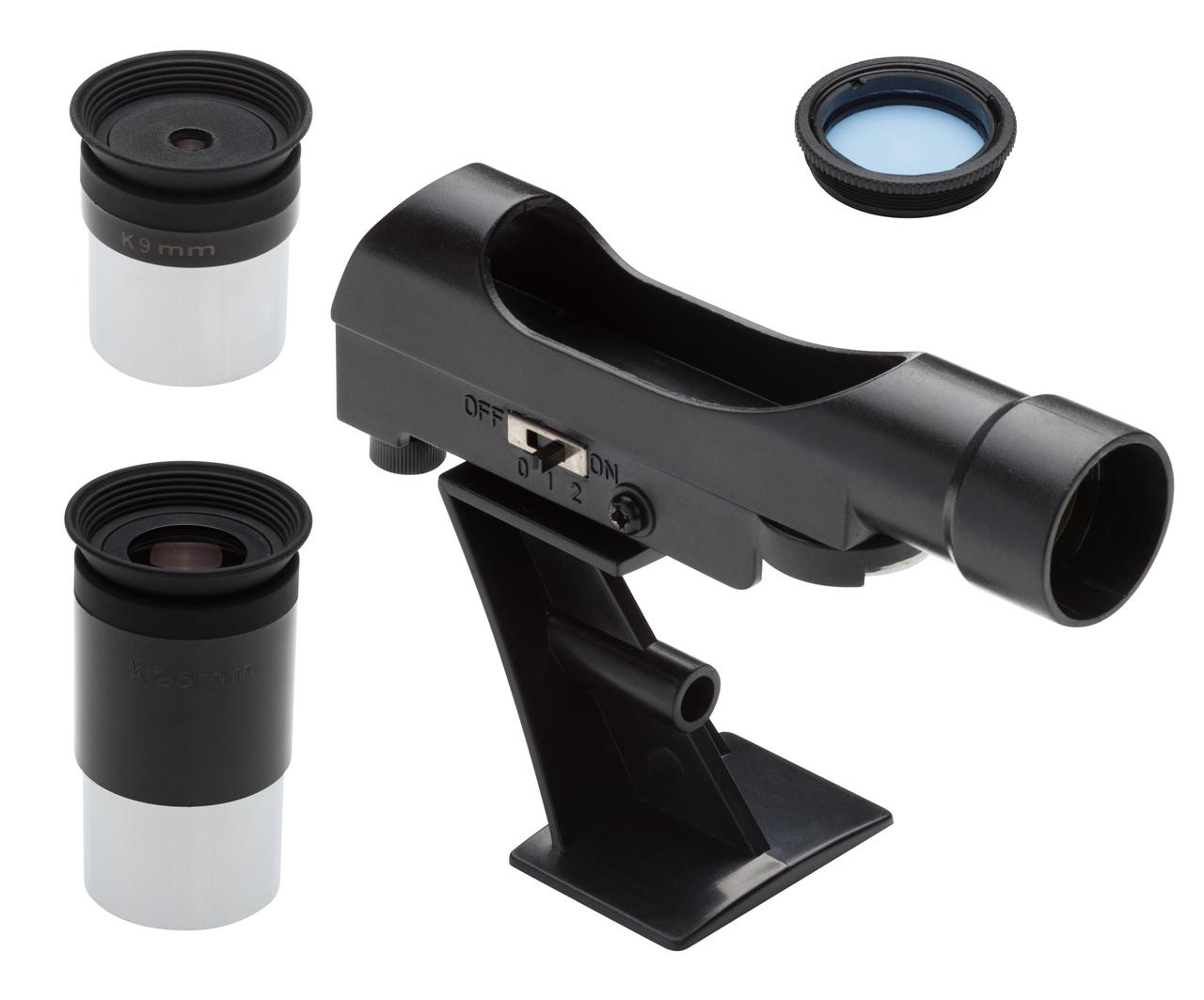 Розширена комплектація включає два окуляри Кельнерової системи, місячний фільтр, а також перехідник, що дозволяє використовувати дводюймові окуляри з широким полем зору.